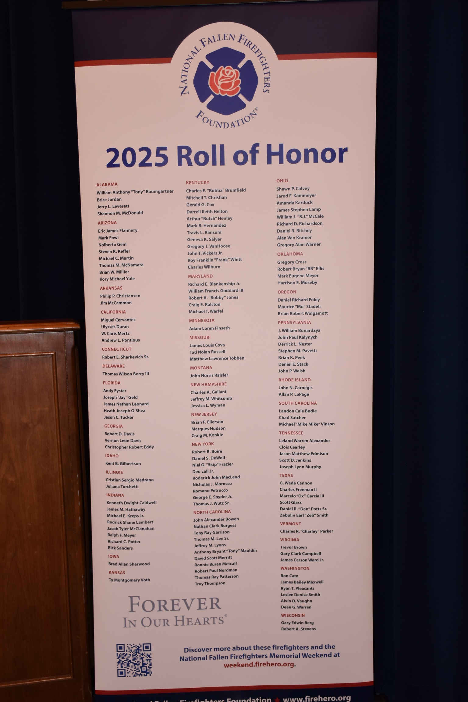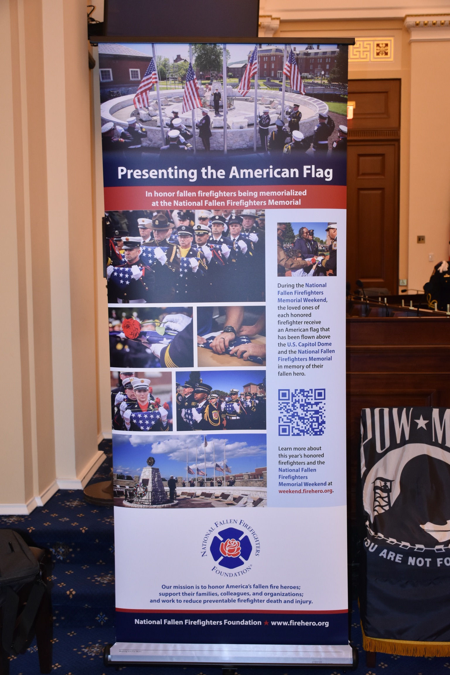 Following the Ceremony, the flags were transferred to Memorial Park at the National Emergency Training Center in Emmitsburg, MD, where they will be flown over the National Fallen Firefighters Memorial. These same flags will play a key role in the upcoming 44th Annual National Fallen Firefighters Memorial Weekend, as the firefighters on this year’s Roll of Honor will be honored by a grateful nation with Fire Hero Families from across the United States in attendance. The individual flags will be presented to each family at the National Fallen Firefighters Memorial Service on Sunday, May 4th, in Emmitsburg, Maryland.