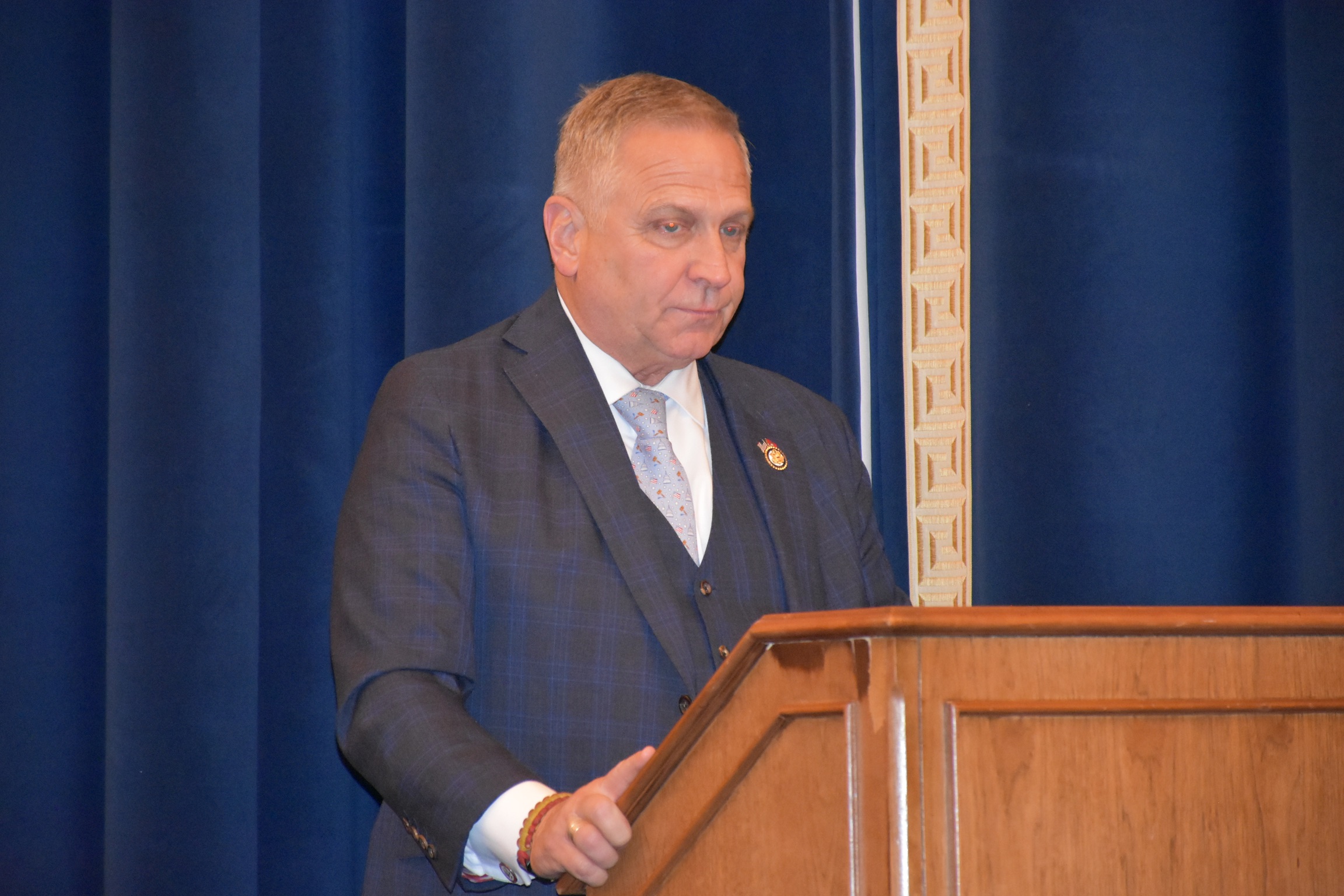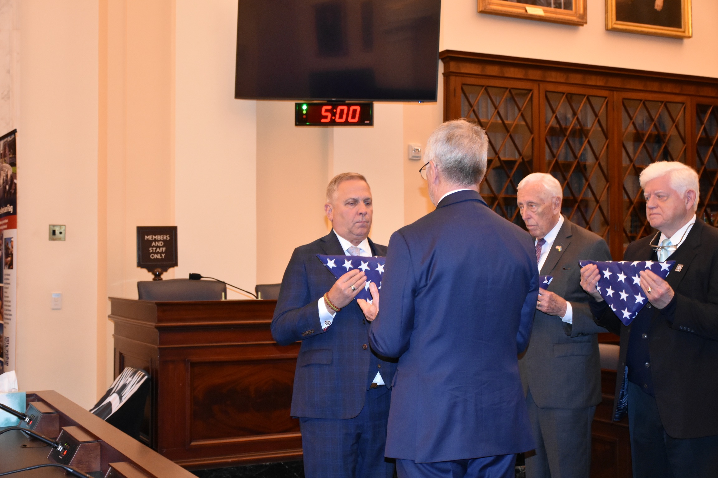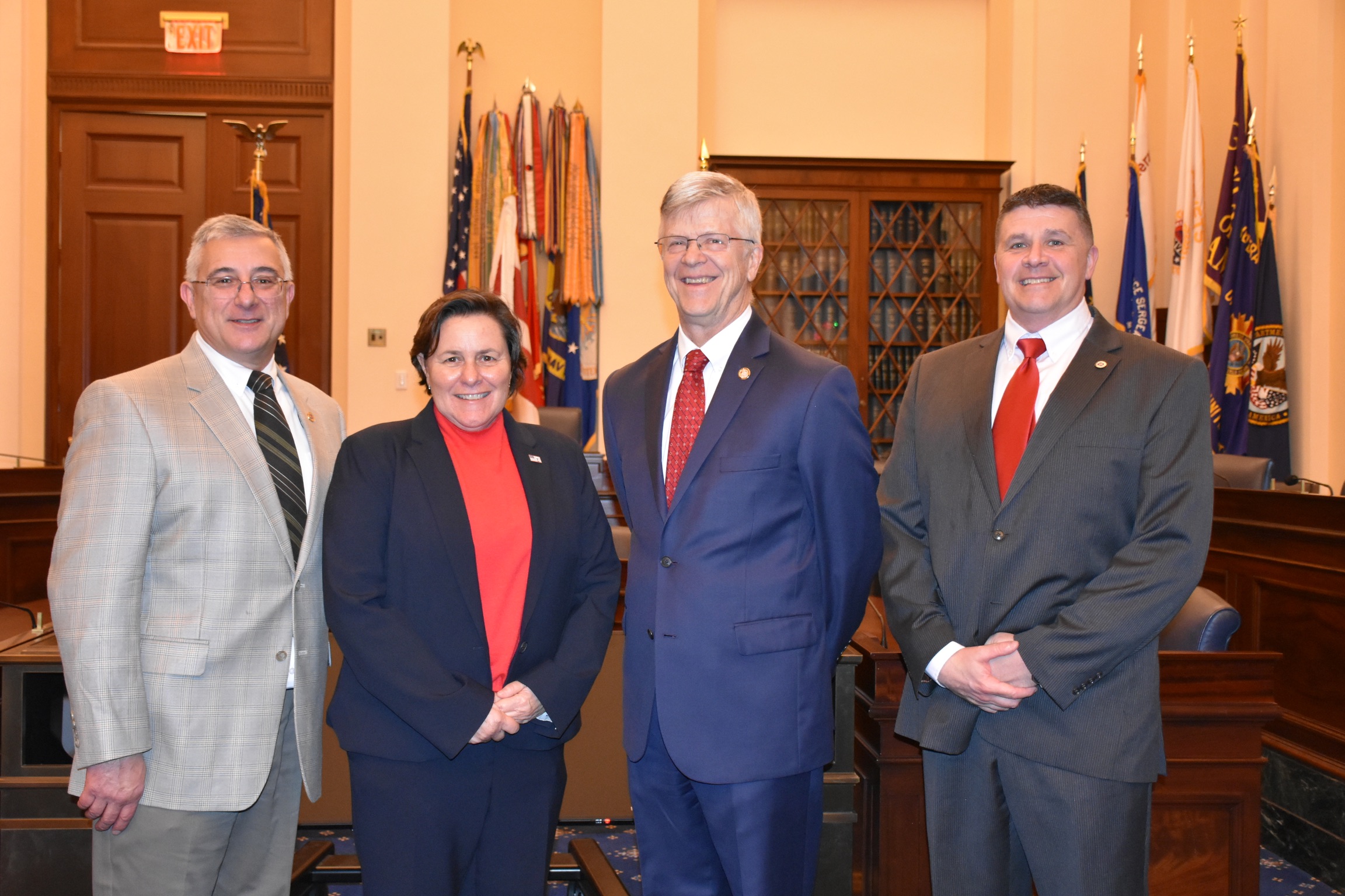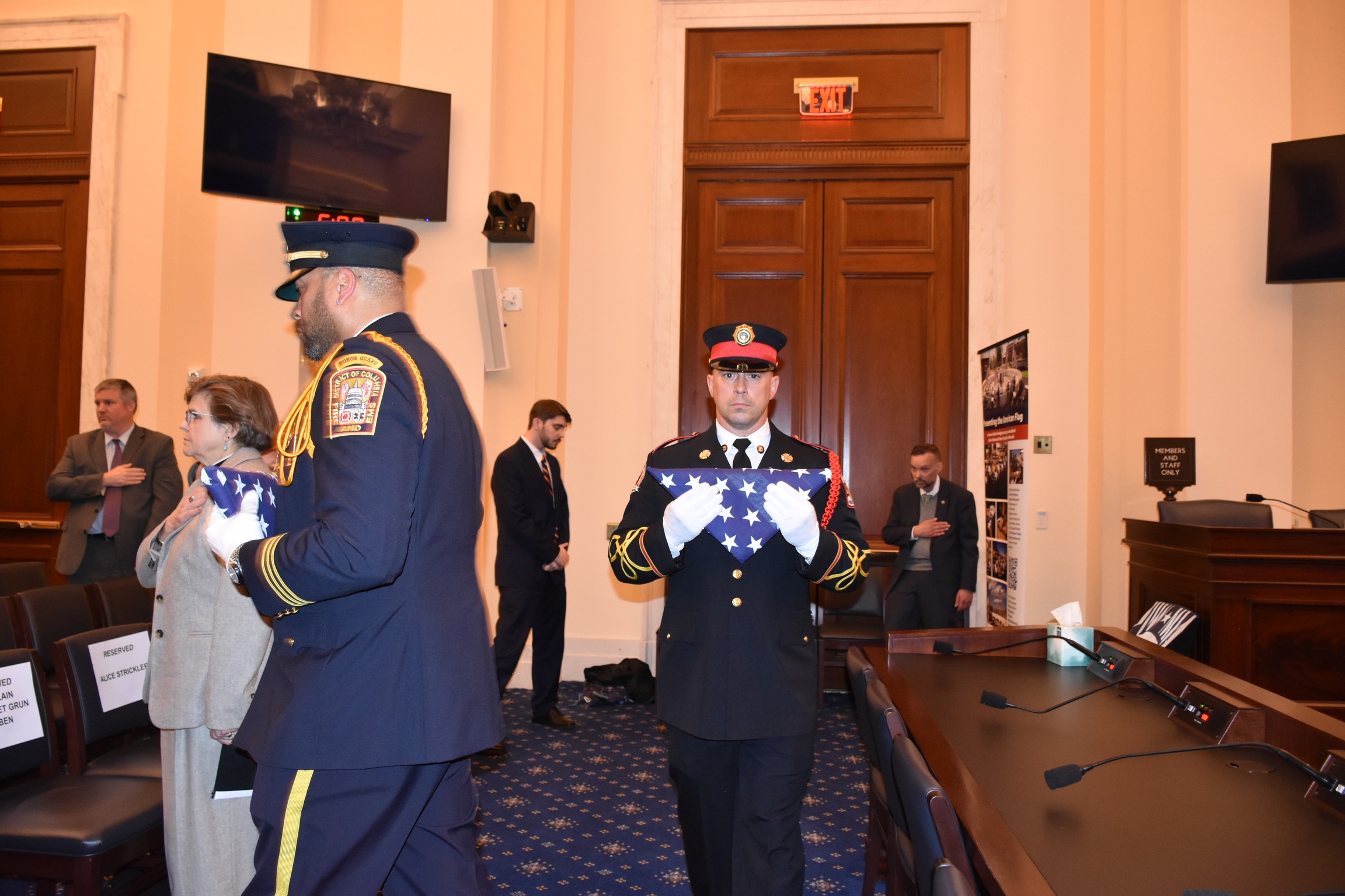 During the Ceremony, members of the Congressional Fire Services Caucus—including Congressman Mike Bost (IL-12), Chair of the Congressional Fire Services Caucus; Congressman Steny Hoyer (MD-5), Dean of the Fire Caucus; and Congressman John Larson (CT-1), Co-Chair of the Congressional Fire Services Caucus—presented the flags to the NFFF. Acting U.S. Fire Administrator Chief Donna Black; NFFF’s Vice-Chair of the Board and Executive Director of the Congressional Fire Services Institute (CFSI) Bill Webb; and NFFF’s CEO Victor Stagnaro participated in this important annual tradition, which took place in the Cannon House Office Building on Capitol Hill. House Chaplain Margaret Grun Kibben provided the Invocation and the Blessing of the Flags, while Alice Strickler, the mother of fallen firefighter Ian Thomas Strickler, recited the Pledge of Allegiance.