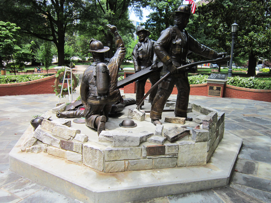 Dedicated May 6, 2006 the North Carolina Fallen Firefighters Memorial is located in the center of historic Nash Square, Raleigh NC. Surrounding this central masterpiece sculpture is a brick wall with granite slabs on which is engraved the names of all North Carolina’s fallen firefighters, past, currently and will also have those fallen in future centuries …thus becoming a “living memorial”.
