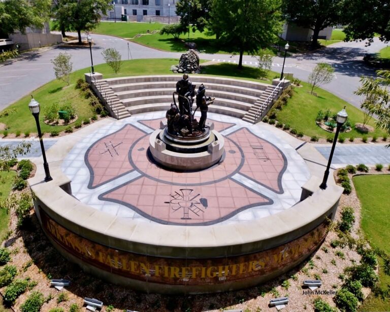 The Arkansas Fallen Firefighters Memorial design features four statues: “Old Leather Lungs”, representing the origins of firefighters; “The Angel of